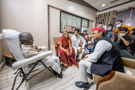 विधानसभा के पूर्व अध्यक्ष सुखदेव राजभर से मिलने पहुचे उनके घर अखिलेश यादव