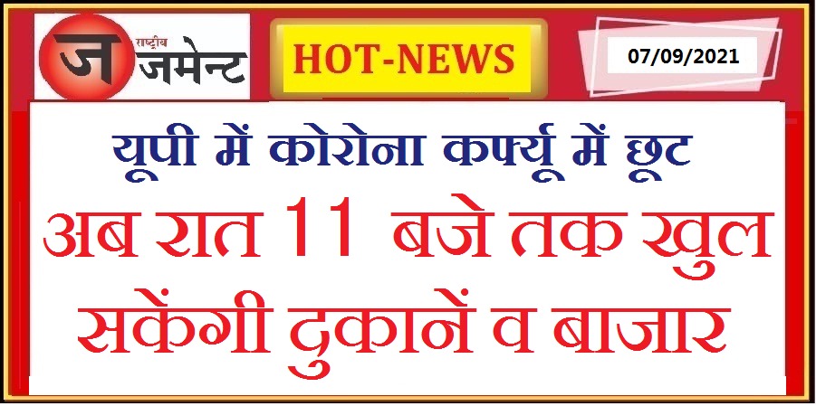 उत्तर प्रदेश में कोरोना की नियंत्रित स्थिति को देखते हुए बाजारों व दुकानों के रात 11 बजे तक खुलने की अनुमति दी गई है। वहीं, रात्रिकालीन कर्फ्यू रात्रि 11 बजे से प्रातः 06 बजे तक प्रभावी रहेगा। इस संबंध में आदेश जारी कर दिए गए हैं।