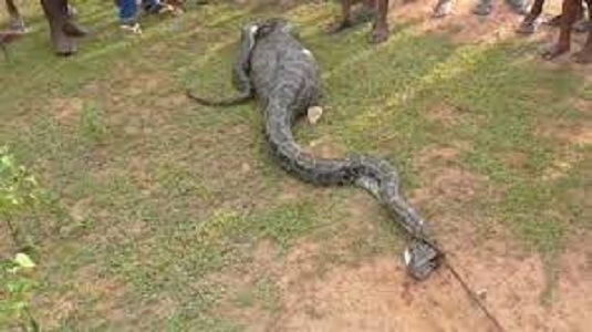 और बकरियों की खोज करने लगा खोज करते समय देखा कि अजगर उसकी बकरी को निकल गया है बच्चा आनन-फानन चिल्लाते हुए घर गया और अपनी मां को बताया साथ में ग्रामीणों ने जाकर देखा तो अजगर बहुत विशालकाय था इसकी लंबाई लगभग 9 से 10 फुट और वजन लगभग 70 से 80 किलो का था जिसको देखते ही ग्रामीणों के होश उड़ गए ग्रामीणों ने उसे पकड़ कर गांव ले आए और जंगल विभाग को सूचना देकर सौप दिया।