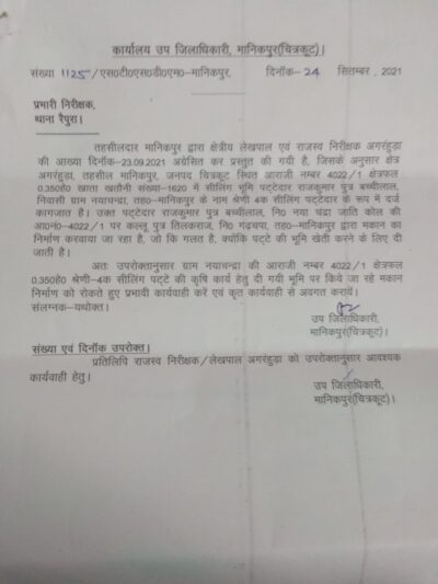 तहसील मुख्यालय मानिकपुर अंतर्गत क्षेत्र अगरहुँडा में पट्टे की भूमि पर निर्माण जारी था जिस पर उपजिलाधिकारी मानिकपुर ने निर्माण कार्य रोके जाने का आदेश पूर्व में किया था किंतु निर्माण कार्य नहीं रुका जिसके चलते बीते पिछले गुरुवार को उप जिलाधिकारी मानिकपुर ने प्रभारी निरीक्षक रैपुरा को पत्र लिखा और कहा है कि तहसीलदार मानिकपुर द्वारा क्षेत्रीय लेखपाल एवं राजस्व निरीक्षक अगरहुँडा की आख्या दिनांक 23- 09-2021 अग्रेषित कर प्रस्तुत की गई है इसके अनुसार क्षेत्र अगरहुँडा तहसील मानिकपुर स्थित आराजी नंबर 4022/1 क्षेत्रफल 0.350हे0 खाता खतौनी संख्या 1620 में सीलिंग भूमि पाट्टेदार राजकुमार पुत्र बच्ची लाल निवासी ग्राम नया चंद्रा के नाम श्रेणी 4क सीलिंग पाट्टेदार के रूप में दर्ज है उक्त पाट्टेदार राजकुमार पुत्र बच्ची लाल निवासी नया चंद्र जाति कोल की आराजी नंबर 4022 पर कल्लू पुत्र तिलक राज निवासी गढ़चपा तहसील मानिकपुर द्वारा मकान का निर्माण कराया जा रहा है जो कि गलत है क्योंकि पट्टे की भूमि खेती करने के लिए दी जाती है |