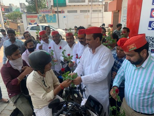पेट्रोल की कीमत 100 रुपए पार होने पर शुक्रवार को समाजवादी पार्टी ने पेट्रोल पंप पर लोगों को गुलाब का फूल भेंट कर गांधीगिरी के जरिए विरोध जताया। सपा नेताओं ने लोगों को फूल देते हुए कहा कि यह है भाजपा के महंगाई वाले अच्छे दिन।