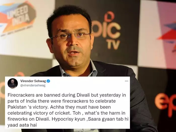 वीरू ने ट्वीट कर इन पटाखों की तुलना दिवाली पर लगे बैन से की। वीरू ने सवालिया लहजे में ट्वीट करते हुए कहा, ‘दिवाली में पटाखे फोड़ने पर बैन है लेकिन कल भारत के कुछ इलाकों में पटाखे जलाकर पाकिस्तान की जीत का जश्न मनाया गया, अच्छा वे क्रिकेट की जीत का जश्न मना रहे होंगे।’ सहवाग ने आगे लिखा, ‘दिवाली में पटाखे जलाने में क्या दिक्कत है। यह ढोंग क्यों, सारा ज्ञान तभी याद आता है।