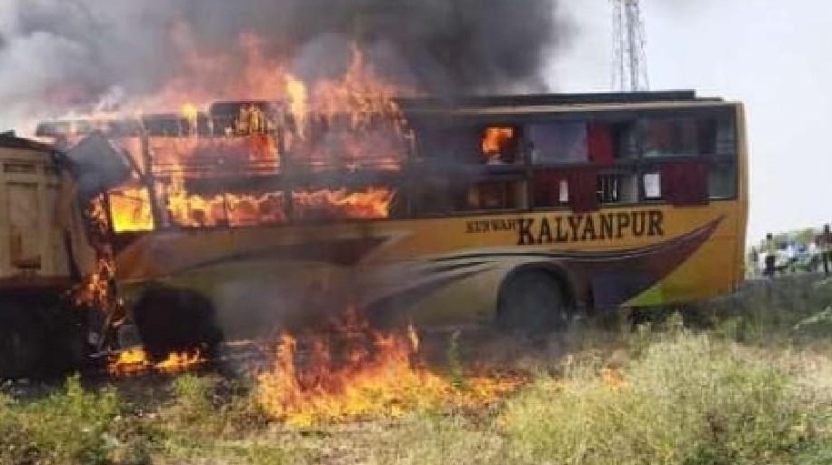 प्राइवेट बस व टैंकर ट्रेलर की भीषण टक्कर, 12 लोगों की जलकर मौत