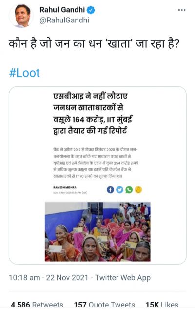 कांग्रेस नेता राहुल गांधई ने मोदी सरकार पर एसबीआई द्वारा लोगों के पैसे वसूलने के आरोप में हमला बोला है। राहुल गांधी ने ट्वीट कर कहा है कि कौन है जो जन का धन ‘खाता’ जा रहा है?। आपको बता दें, राहुल गांधी ने ट्विटर पर एक स्क्रीन शॉट भी शेयर किया है। दरअसल, इस ट्विट के स्क्रीनशॉट के अनुसार, स्टेट बैंक ऑफ इंडिया ने गरीबों के जन धन खाता धारकों के अकाउंट से 164 करोड़ रुपये वसूले थे लेकिन ये उनको अब तक नहीं लौटाए गए हैं।