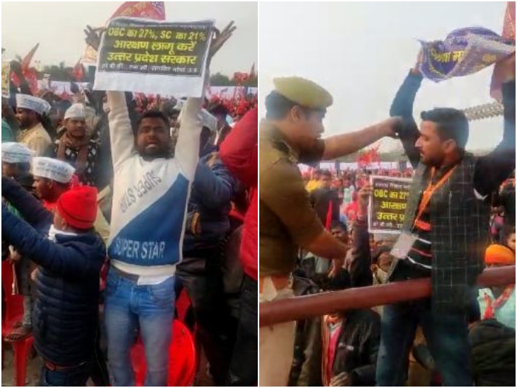 लखनऊ में शुक्रवार को अमित शाह की रैली में हंगामा हो गया। 50 की संख्या में पहुंचे प्रतियोगी छात्रों ने एकाएक नारेबाजी शुरू कर दी। छात्रों ने शिक्षा मंत्री चोर है के नारे लगाए। बैनर लहराए। एकाएक छात्रों के प्रदर्शन से वहां भगदड़ जैसे हालात हो गए। पुलिस के जवान भागते हुए छात्रों के पास पहुंचे। उन्होंने छात्रों से बैनर-पोस्टर छीने और वहां से खदेड़ा। प्रतियोगी छात्र नहीं माने तो पुलिस ने हल्का बल प्रयोग कर आरक्षण की मांग करने वालों को वहां से खदेड़ा।