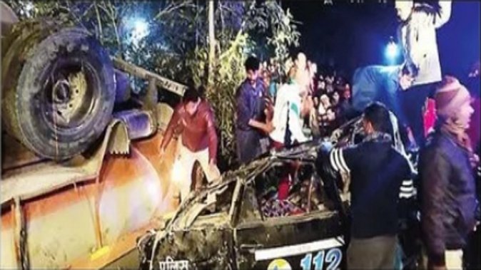 उत्तर प्रदेश के उन्नाव जिले में हरदोई-उन्नाव मार्ग पर सफीपुर कोतवाली इलाके के साल्हेनगर करौंदी गांव में दूध का टैंकर पुलिस की पीआरवी पर पलट गया। हादसे में तीन पुलिसकर्मियों की टैंकर के नीचे दबने से मौत हो गई। एक सिपाही को सुरक्षित निकाल लिया गया। हादसे की वजह से उन्नाव-हरदोई मार्ग पर दो घंटे तक जाम लगा रहा।