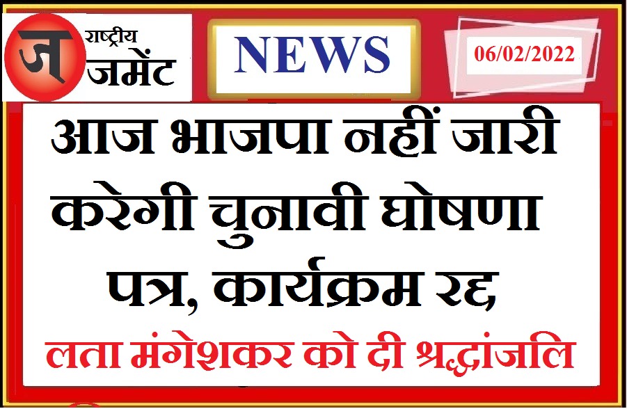 उत्तर प्रदेश विधानसभा चुनाव के लिए भाजपा आज घोषणा पत्र नहीं जारी करेगी। भारत रत्न लता मंगेशकर के निधन के बाद पार्टी ने यह फैसला लिया। पार्टी कार्यालय पर भाजपा नेताओं ने लता मंगेशकर को श्रद्धांजलि दी और इसके बाद के सारे कार्यक्रम स्थगित कर दिए।