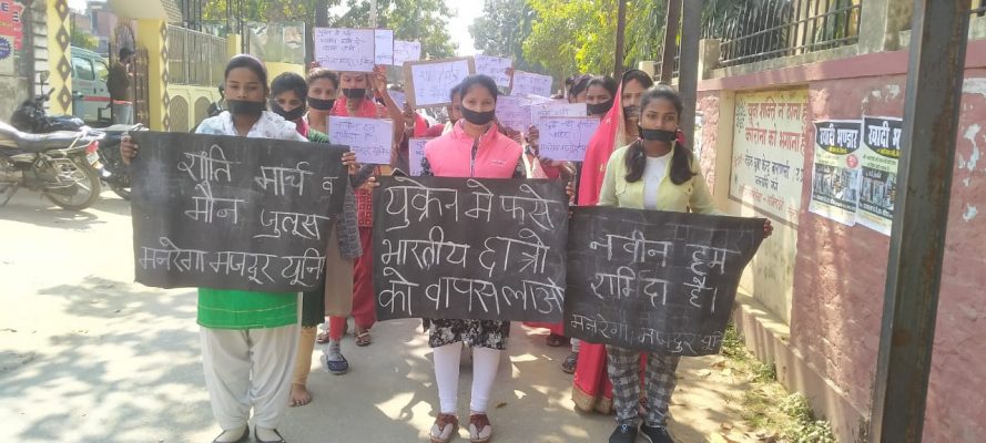 वाराणसी राजातालाब यूक्रेन और रूस से हो रहे युद्ध के दौरान कल एक भारतीय छात्र की मौत हो गई जिसमें आज मनरेगा मजदूर यूनियन से जुड़े किशोरी युवा मंच द्वारा यूक्रेन में भारतीय छात्र की मौत व हिंसा के खिलाफ मौन जुलूस निकाला गया मौन जुलूस में हिंसा नहीं शांति चाहिए क्षुब्द ह्रदय है बंद जुबान आदि नारे के साथ लिखी शक्तियों को लेकर सभी किशोरियों ने भारतीय छात्रों की सही सलामती वापसी की मांग की जुलूस मनरेगा मजदूर यूनियन कार्यालय से निकलकर ब्लॉक मुख्यालय आराजी लाइन तक निकाला गया |