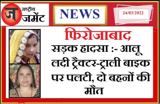 फिरोजाबाद के नगला भाव सिंह बरामई के समीप आलू से भरी ट्रैक्टर-ट्राली पलटने से बाइक सवार दो बहनों की मौत हो गई। एक ने मौके पर जबकि दूसरी ने आगरा उपचार को ले जाते समय दम तोड़ दिया। पुलिस ने शवों को पोस्टमार्टम के लिए भेजा। ट्रैक्टर चालक की तलाश की जा रही है।