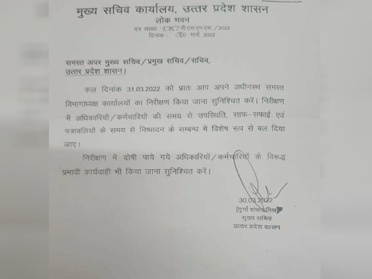 उत्तर-प्रदेश में नई सरकार के गठन के साथ ही मंत्री से लेकर अधिकारी तक एक्शन में आ गए है। एक सतर सीएम ताबड़-तोड़ फैसले ले रहें है तो दूसरी तरफ मंत्री से लेकर अधिकारी तक उसे जमीन पर उतारने की कवायद में जुट गए है। उत्तर-प्रदेश के मुख्य सचिव डीएस मिश्रा भी आज अफसरों की दफ्तर में उपस्थिति चेक करेंगे।