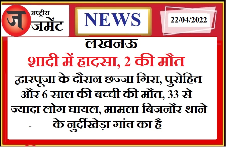 लखनऊ मे गुरुवार देर रात शादी समारोह के दौरान बड़ा हादसा हो गया। द्वारचार पूजन के दौरान अचानक छज्जा भरभराकर गिर गया। हादसे में पुरोहित और छह साल की बच्ची की मौत हो गई। जबकि 30 से ज्यादा लोग घायल हैं। घायलों में ज्यादातर महिलाएं और बच्चे हैं। सभी को लोकबंधु अस्पताल में भर्ती कराया गया है। इनमें से कुछ की हालत बेहद नाजुक है। हादसा बिजनौर थाने के नुर्दीखेड़ा गांव की है।