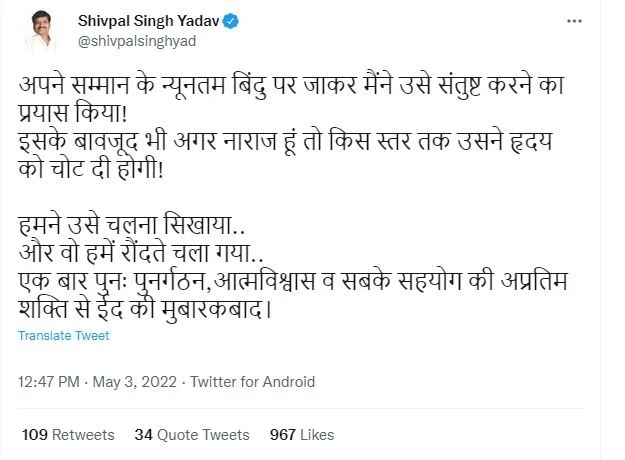 शिवपाल यादव ने अपने ट्वीट में लिखा, ‘अपने सम्मान के न्यूनतम बिंदु पर जाकर मैंने उसे संतुष्ट करने का प्रयास किया! इसके बावजूद भी अगर नाराज हूं तो किस स्तर तक उसने हृदय को चोट दी होगी! हमने उसे चलना सिखाया.. और वो हमें रौंदते चला गया.. एक बार पुनः पुनर्गठन,आत्मविश्वास व सबके सहयोग की अप्रतिम शक्ति से ईद की मुबारकबाद।