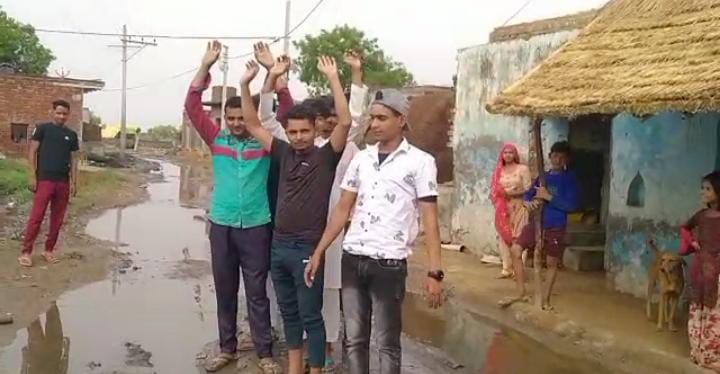 खैर राजपुर गांव में रास्ते में जलभराव को लेकर ग्रामीण लोगों ने ग्राम प्रधान के खिलाफ हाथ उठाकर किया विरोध प्रदर्शन