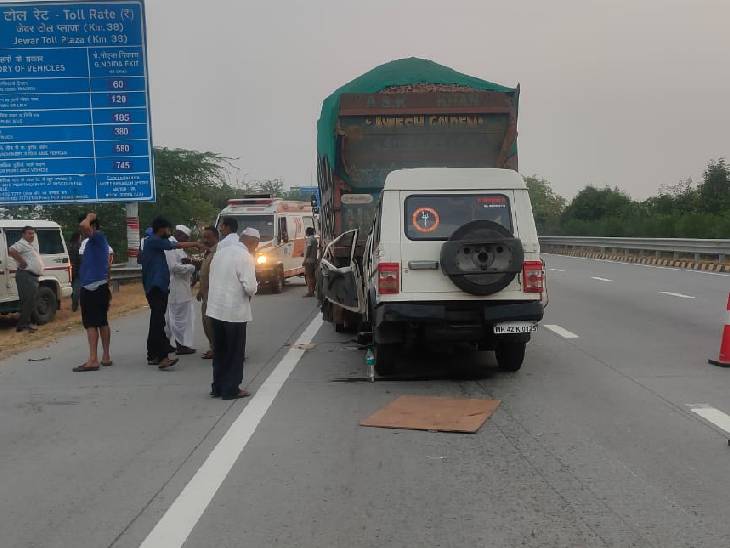 ग्रेटर नोएडा में यमुना एक्सप्रेस-वे पर गुरुवार सुबह भीषण सड़क हादसा हुआ। यहां तेज रफ्तार बोलेरो पीछे से एक डंपर में घुस गई। हादसे में चार महिलाओं समेत 5 की मौके पर मौत हो गई। हादसा जेवर इलाके में तड़के 5 बजे के करीब हुआ। टक्कर इतनी जोरदार थी कि बोलेरो के आगे का हिस्सा डंपर में घुस गया। पुलिस का कहना है कि ड्राइवर को नींद आने की वजह से हादसा हुआ है। बोलेरो सवार लोग मथुरा से ग्रेटर नोएडा की तरफ आ रहे थे। सभी मृतक महाराष्ट्र और कर्नाटक के रहने वाले थे। यमुना एक्सप्रेस-वे से गुजर रहे लोगों ने हादसे की सूचना जेवर थाना पुलिस को दी।