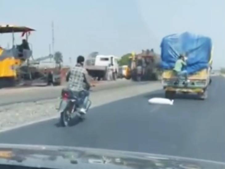 VIDEO में देखा जा सकता है कि चलती बाइक पर पीछे बैठा बदमाश बड़ी आसानी से चलते हुए ट्रक पर चढ़ता है। इसके बाद ट्रक में रखी बोरियों को पैरों में बोरी दबाकर नीचे गिरा देता है। पीछे-पीछे बाइक पर चल रहा उसका साथी बोरी गिरने के बाद चलते ट्रक से ही युवक को बाइक पर बैठा लेता है।