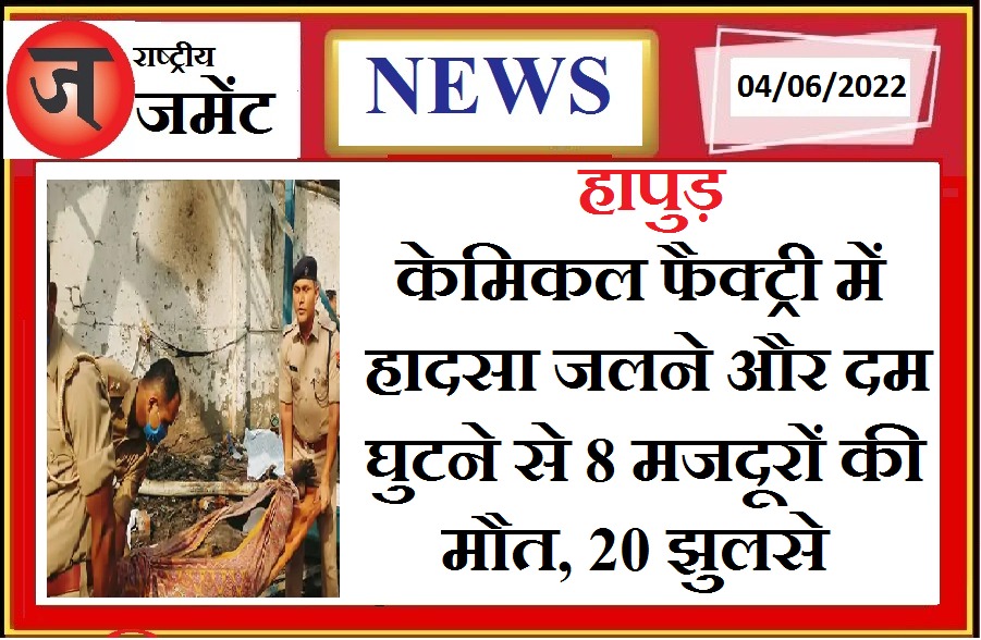 हापुड़ में केमिकल फैक्ट्री में भीषण आग हादसा, आग लगने से 8 लोगों की मौत हो गई है। 6 शव बाहर निकाले गए हैं। हादसे में 20 लोग झुलस गए हैं। मौके पर पुलिस और दमकल विभाग राहत बचाव में जुटा है। झुलसे हुए लोगों की हालत नाजुक है, मृतकों की संख्या बढ़ सकती है।