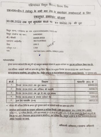 बिजली का उपयोग नहीं किया जा रहा है। फिर भी बिजली विभाग ने मृतक दरवा के विरुद्ध एकमुश्त समाधान योजना में 60512.21 का वसूली नोटिस जारी कर दिया जिससे मृतक दरबा की विधवा पत्नी सुख्खो के होश उड़ गए और पैरों तले जमीन खिसक गई। सुख्खो पत्नी दरवा निवासी पटपरगंज ने स्वयं का नोटरी शपथ पत्र अधिशासी अभियंता विद्युत वितरण खंड खेरागढ़ को देकर भेजे गए वसूली नोटिस को वापस कर कार्यवाही समाप्त करने की मांग की।