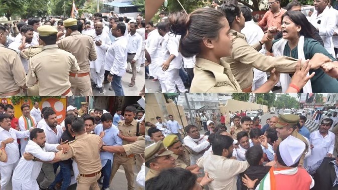 प्रदर्शनकारी गांधी प्रतिमा की तरफ जा रहे थे तो उनसे पुलिस की झड़प हो गई। वहीं, कांग्रेस नेता आराधना मिश्रा मोना के साथ ही कई नेताओं को हाउस अरेस्ट किया गया है।